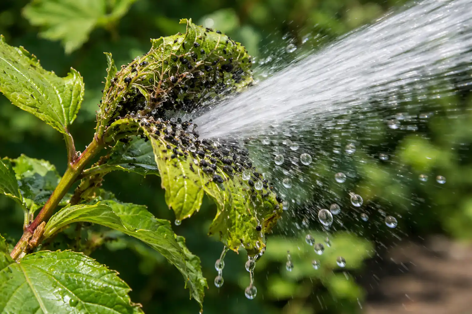 Az első dolog, amit teszek mechanikus eltávolítás levéltetvek. Ha kevés a rovar, egyszerűen lemoshatja őket egy slag erős vízsugarával. Ezt óvatosan kell végezni, hogy ne sérüljenek meg a fiatal hajtások. A levéltetvek kézzel, kesztyűben történő összegyűjtése is hatékony.
