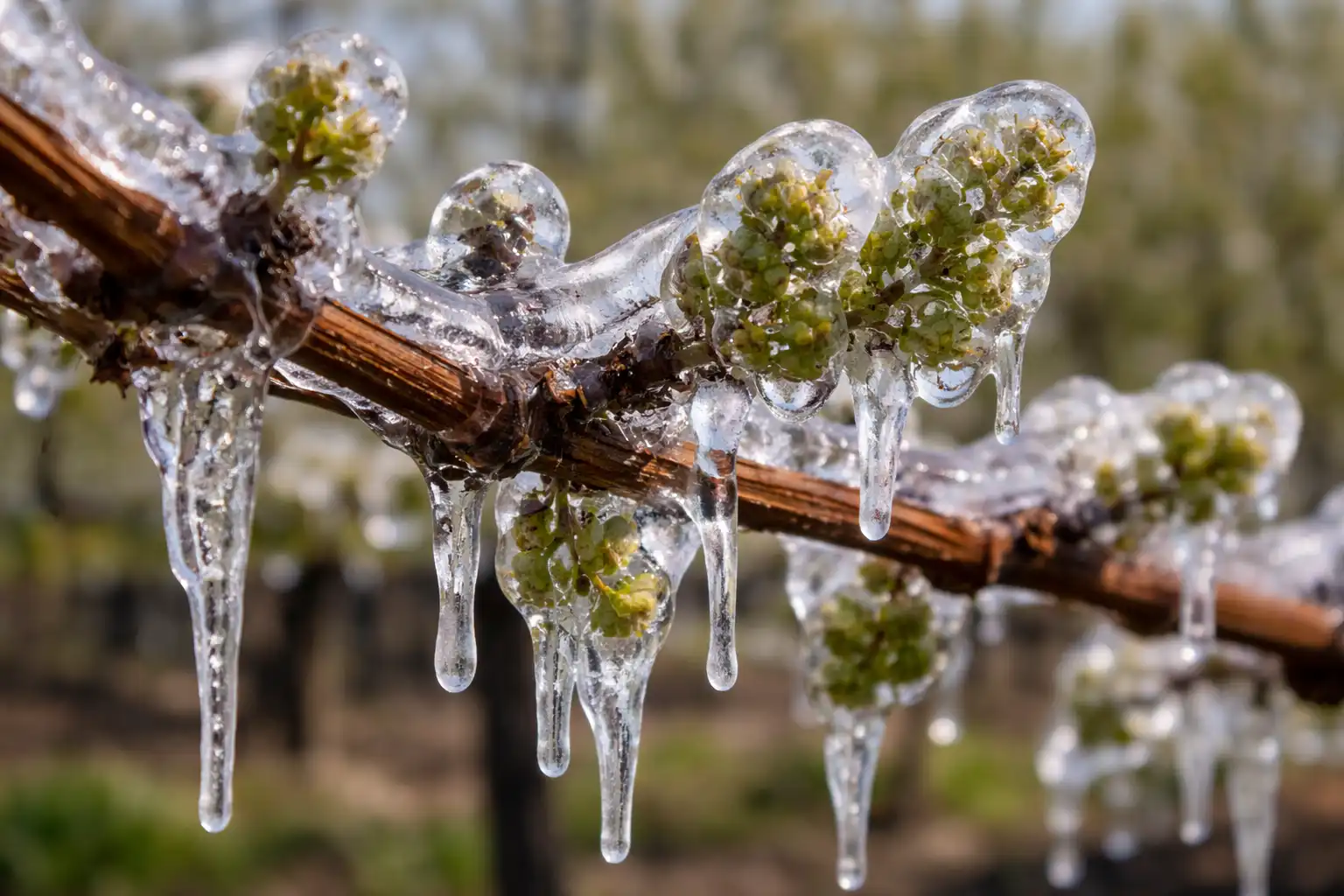 A bogyók hiányának fő oka a károsodás. központi rügy. A szőlő képes pótrügyeket kibocsátani, de ezek többnyire terméketlenek. Ennek elkerülése érdekében a „jéghéj” módszerét alkalmazom, vagy a krioprotektív öntözés. Az ötlet lényege, hogy a víz megfagyjon a tőkén, felszabadítva ezzel a látens hőenergiát, amely megakadályozza, hogy a benne lévő szövetek kritikus pontig lehűljenek.