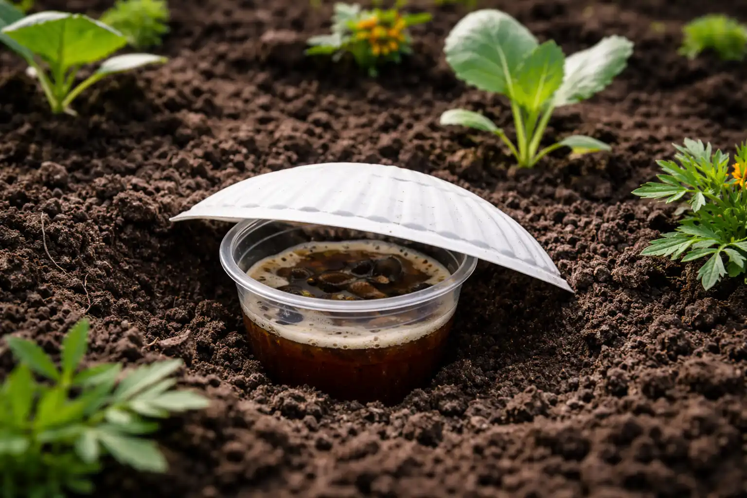 – Ássunk kis műanyag poharakat a földdel egy szintbe. – Töltse meg őket egyharmadig sötét sörrel vagy víz, élesztő és cukor keverékével. – Fedjük le a tetejét egy eldobható tányér felével, hogy az eső ne jusson bele. – Minden reggel ellenőrizze és tisztítsa meg a tartályokat.