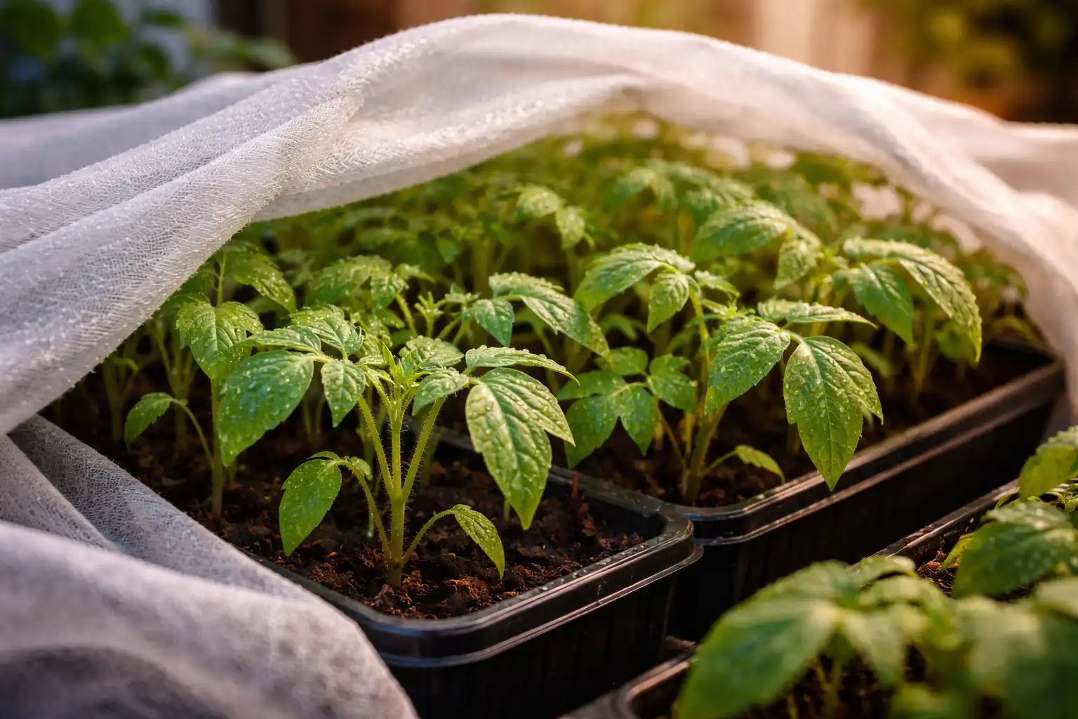 Fedje le a palántákat egy könnyű, nem szőtt textíliával, hogy üvegházhatást keltsen.