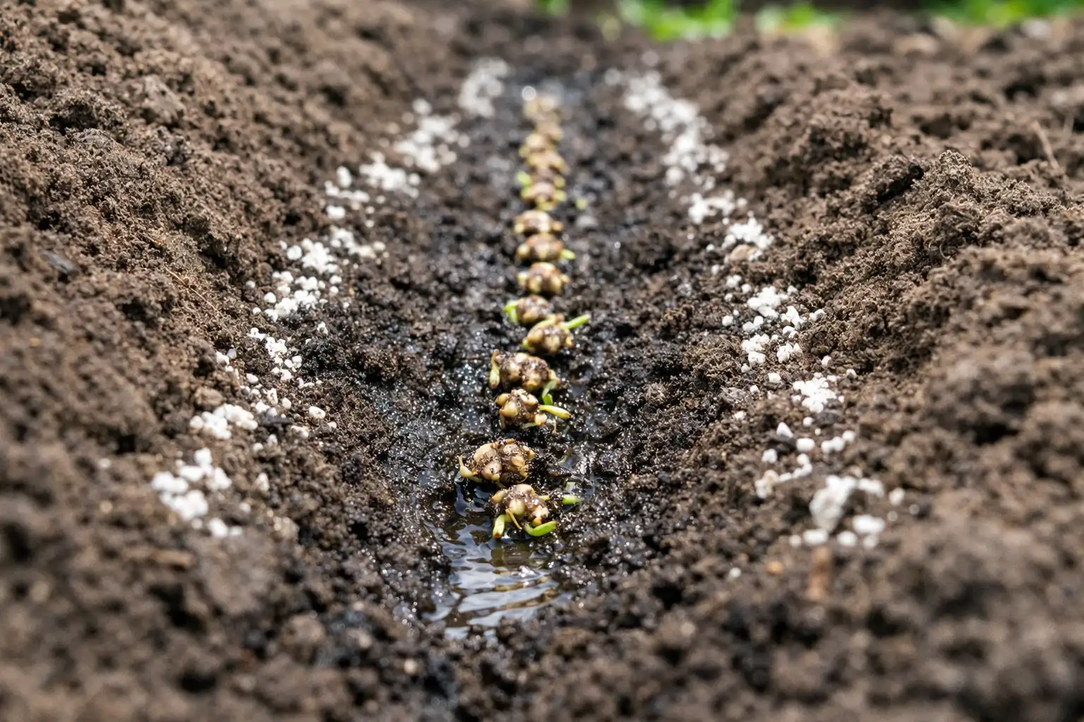 Titkos árnyalat: ha a parcella talaja savanyú, vetés előtt öntsünk krétaoldatot a barázdákba. Ez azonnal semlegesíti a savasságot a gyökérnövekedési zónában, és a növény kalciumhoz jut.