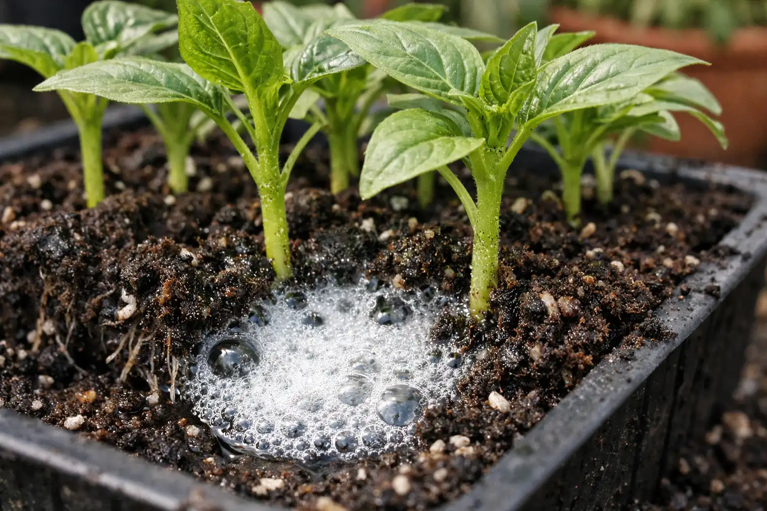 2 evőkanál/liter víz koncentrációban az oldat teljesen biztonságos a palánták számára.