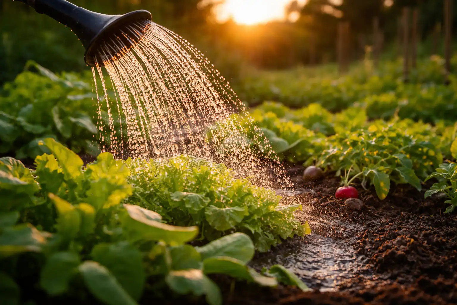 Az esti hidratálás különösen fontos a retek, zöldek és ültetett palántákamelyek nedvességhiány esetén azonnal elhervadnak. Nappali öntözéskor a leveleken lévő vízcseppek lencseként működnek, fókuszálják a napsugarakat, és hőégést hagynak maguk után, ami nagymértékben gátolja a növény növekedését.