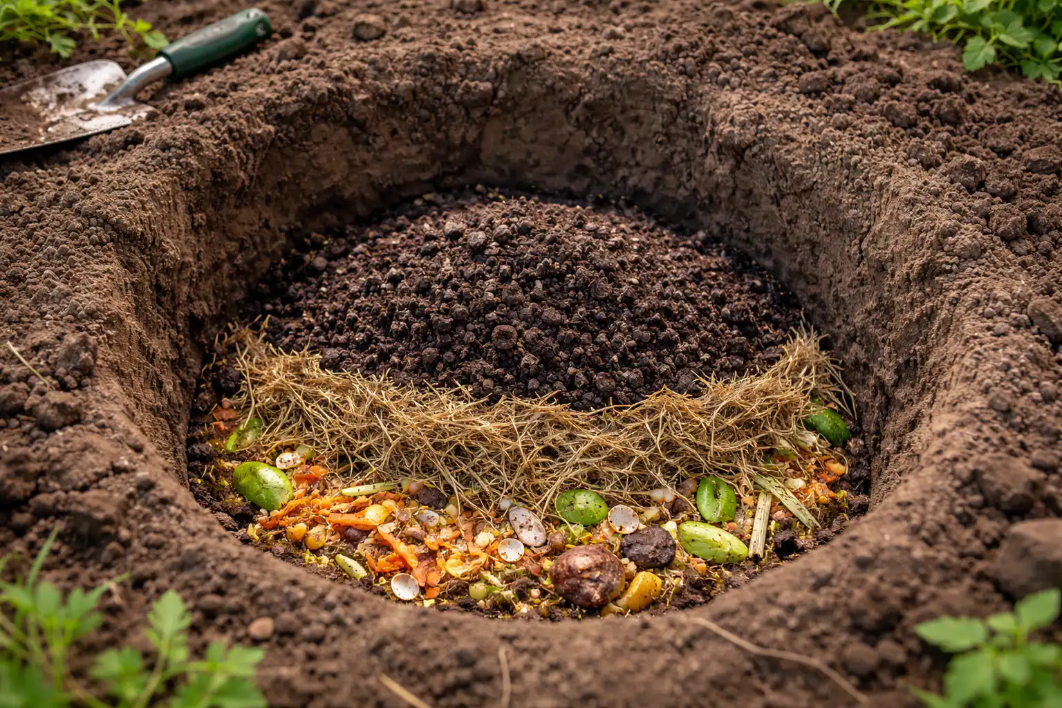 Az alsó réteget töltse fel friss szerves anyaggal (széna, fű, vékony ágak).