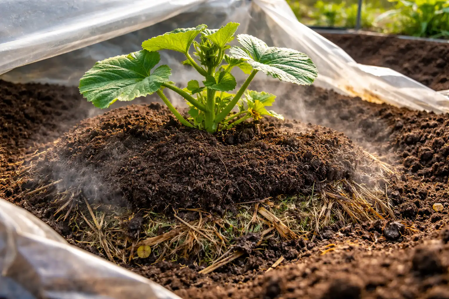 Ahhoz, hogy a sütőtök úgy növekedjen, mint az élesztő, „meleg indításra” van szüksége. Javaslom a helyhez kötött biofűtés módszerét. Egy héttel az ültetés előtt ássunk egy kb. ásószuronynyi mély gödröt, és tegyünk bele frissen vágott füvet vagy tavalyi szénát komposzttal keverve.