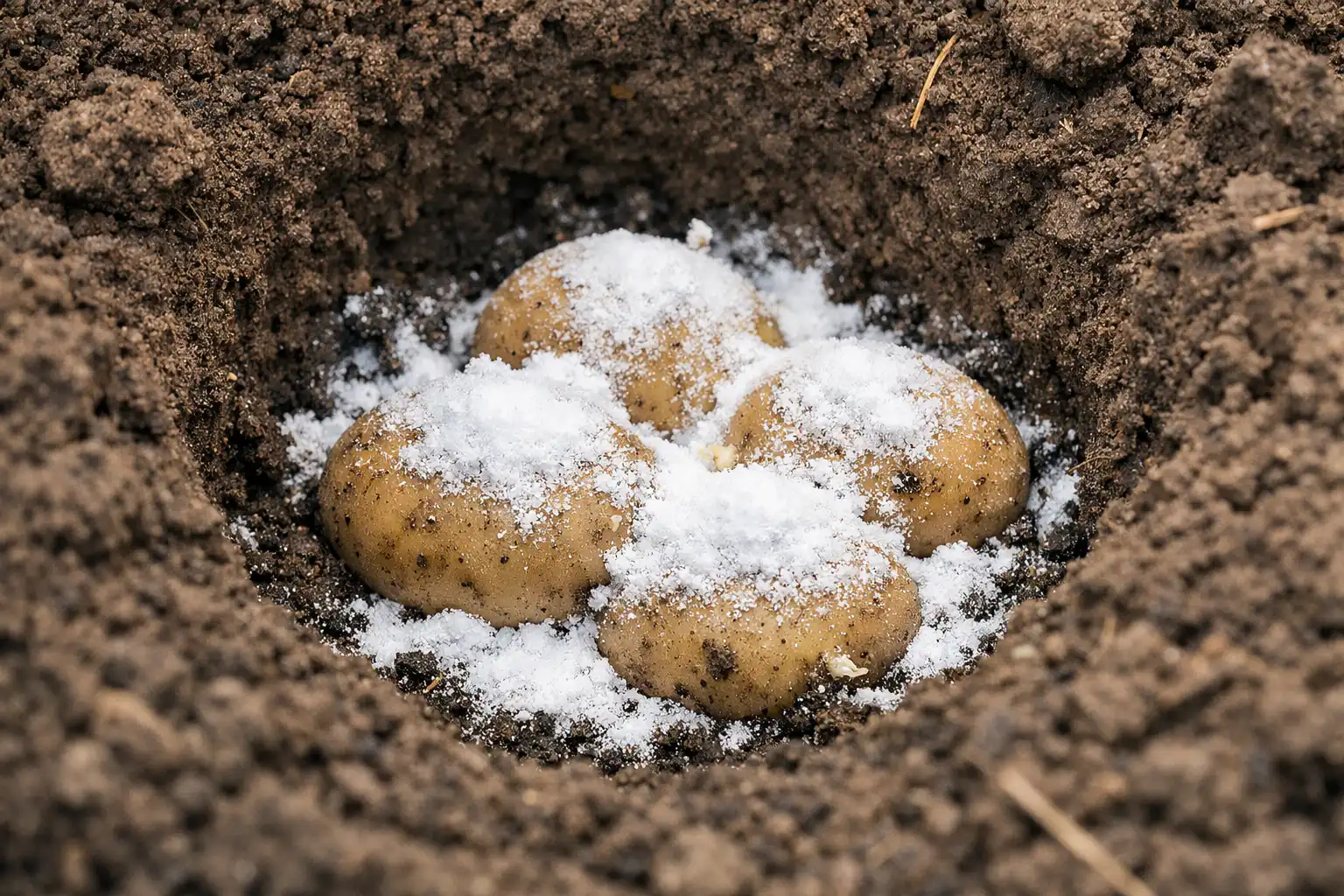 Titkos árnyalat: soha ne öntsünk szódabikarbónát „szemmel” közvetlenül a gumóra. Hogy elkerüljük a zsenge csírák megégését, keverjük össze száraz homokkal vagy fahamuval egy az egyhez arányban. Ez egy puha védőgubót hoz létre a burgonya körül.